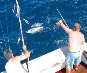 Acres of tuna are busting water all around us at Poormans Canyon, there are five boats trolling for yellowfin in the frenzy, and all of our baits are going unmolested. For half an hour we zig and zag…