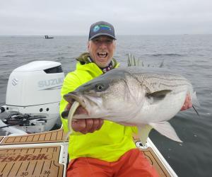 Captain Steve with a nice winter striper. Oooh, we can't…
